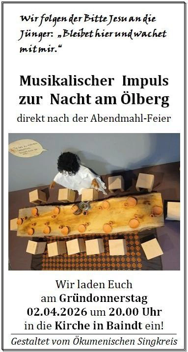 direkt nach der Abendmahl-Feier gestaltet vom Ökumenischen Singkreis. Wir laden Euch am Gründonnerstag um 20.00 Uhr in die Kirche in Baindt ein zur gemeinsamen Betstunde.